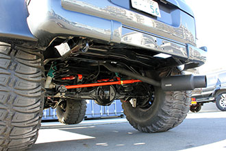 6インチアップもオーバーフェンダーも、生産予定のパーツで組上げています。太く大きなタイヤを支える、スプリングやブッシュも強化しました。運転席から見る外の風景も、モンスター級です。