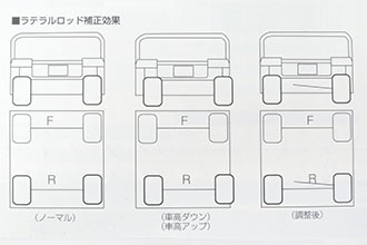 リフトアップやローダウンをそのまま行うと、タイヤとフェンダーが左右にズレてしまいます。調整式のラテラルロッドを使用することで、このズレを補正して、正しい位置に調整することができる様になります。