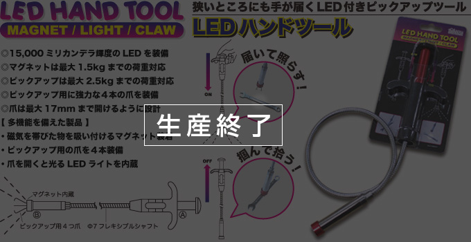 持ち上げ部(上図A部分)を引っ張り上げることで、先端部分(上図B部分)からLEDライトが照射され、また同時に磁気を帯びていない製品をつかみ取ることができます。