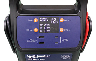 リン酸鉄リチウム電池を高精度に制御する最新回路を搭載。12V/24V切り換え対応で、耐久性とパワーを兼ね備えたジャンプスターターです。