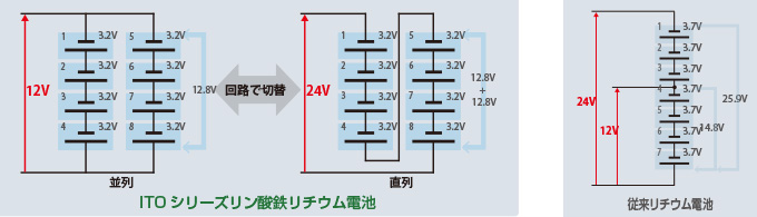 高い熱安定性を保ちながら、4000回以上の充放電サイクルに耐える長寿命バッテリーです。これは、一般的なリチウム(三元系)電池と比べて約5倍の寿命に相当します。 さらに、直列/並列回路を自動で切り替える最新システムにより、電池を均等に使用できるため、全体の寿命を大幅に延ばすことができます。
